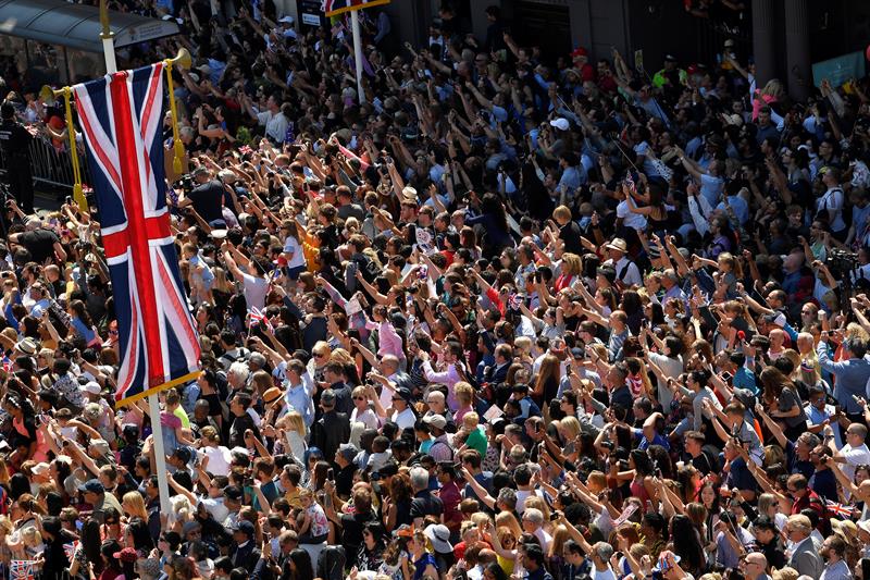 El recorrido estuvo engalanado por un ambiente festivo con gente ondeando banderas británicas, luciendo sombreros de la “Union Jack” y algunos portando máscaras del príncipe Enrique y Meghan Markle.