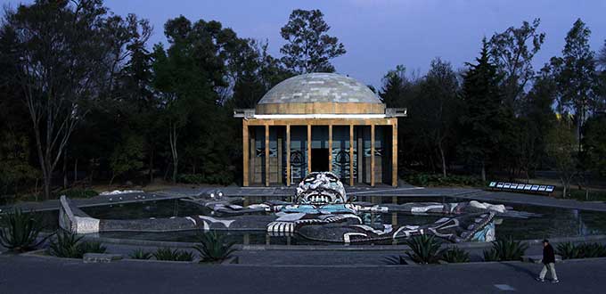 Esa fuente, cuyo fondo es obra de Rivera, contiene una enorme escultura de la serpiente emplumada en colores verde, amarillo, blanco y rojo, que reposa en el agua mientras ve al cielo, desde donde se esperaba que también fuera apreciada, al paso de los aviones.
