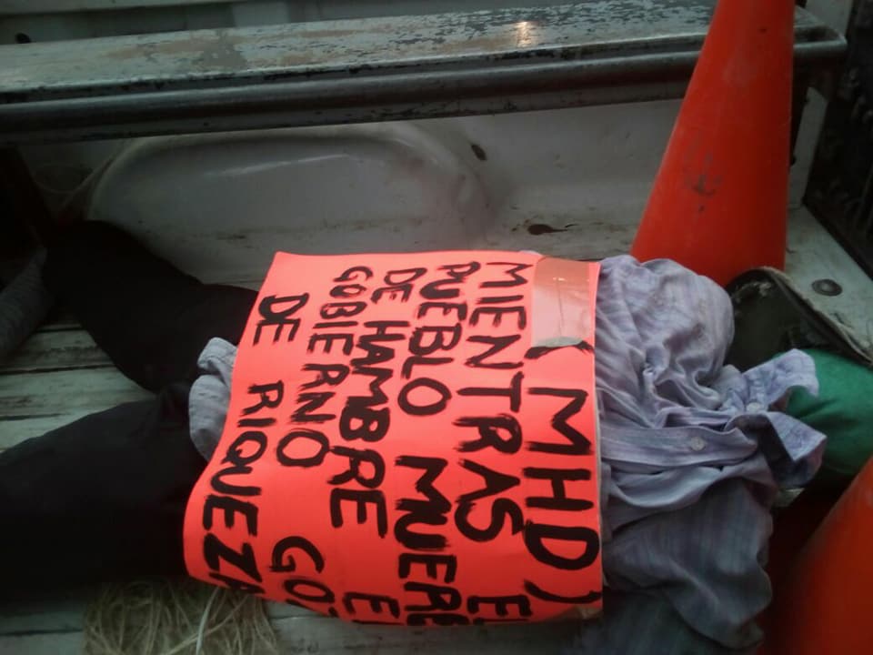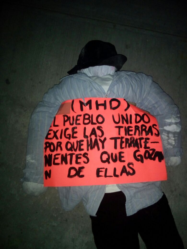 “Mientras el pueblo muere de hambre, el gobierno goza de riqueza”, “entreguen las tierras”, “el pueblo unido exige las tierras, porque hay terratenientes que gozan de ellas”, son algunos de los mensajes que se escribieron sobre las cartulinas pegadas a los muñecos de trapo y rellenos de papel.
