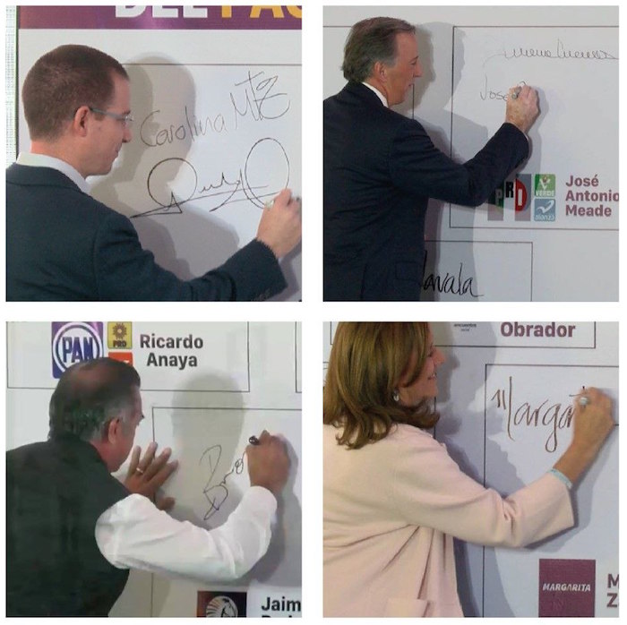 Los candidatos a la Presidencia, Jaime Rodríguez Calderón, Ricardo Anaya Cortés, Margarita Zavala y José Antonio Meade Kuribreña firmaron el Pacto por la Primera Infancia que incluye diez compromisos y cinco condiciones estructurales para que más de 12 millones de niños de 0 a 5 años reciban una adecuada nutrición, seguridad, protección, aprendizaje y cuidado cariñoso.