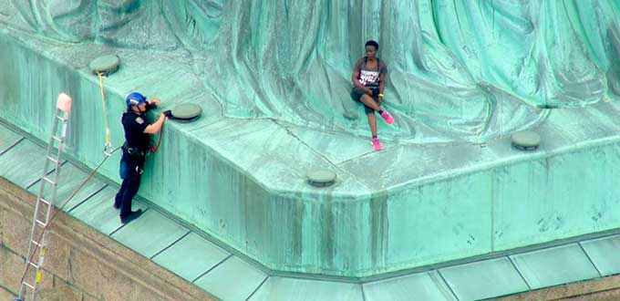 Okoumou alcanzó la base de la estatua alrededor de las 15:00 horas locales del miércoles, lo que obligó al cierre de ese sitio icónico y una operación que se prolongó durante más tres horas y que culminó con el arresto de la activista.