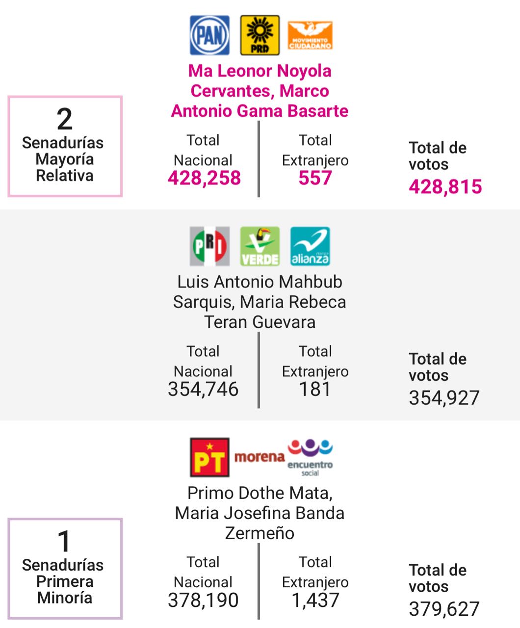 Con el 100 por ciento de las actas computadas de acuerdo al sistema del Instituto Nacional Electoral (INE), la fórmula de la coalición “Por México al Frente” (PAN-PRD-MC), ganó la elección para el senado de la República con 428 mil 815 votos a favor.