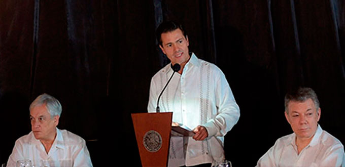 Ante los presidentes de Colombia, Juan Manuel Santos; de Chile, Sebastián Piñera, y de Perú, Marín Vizcarra, el presidente Peña Nieto hizo un breve balance de los logros de su gestión y la consolidación de un paquete de reformas estructurales derivadas de la agenda del Pacto por México.