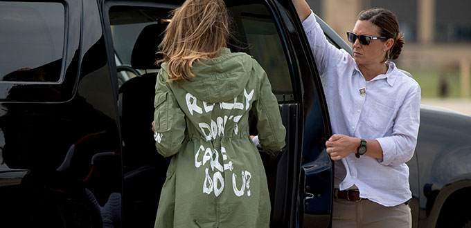 «Realmente no me importa, ¿y a ti?», rezaba la frase impresa en mayúsculas blancas y en inglés sobre la gabardina que Melania llevó al salir y entrar del avión que la transportó de Washington a Texas.
