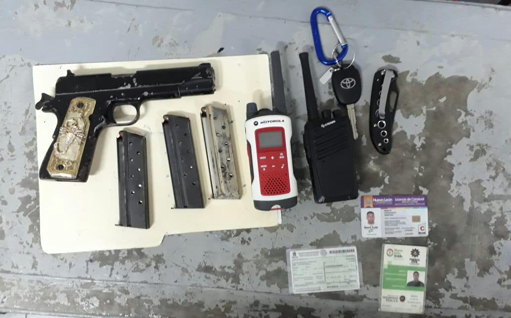 Los sospechosos viajaban en una camioneta Toyota RAV color azul con placas de Nuevo León, a bordo de la cual se localizó un arma de fuego tipo escuadra calibre .38 súper con 03 cargadores abastecidos; 23 cartuchos de calibre .38 súper y 4 cartuchos de 9 milímetros; dos radios; una navaja y una tarjeta de circulación.