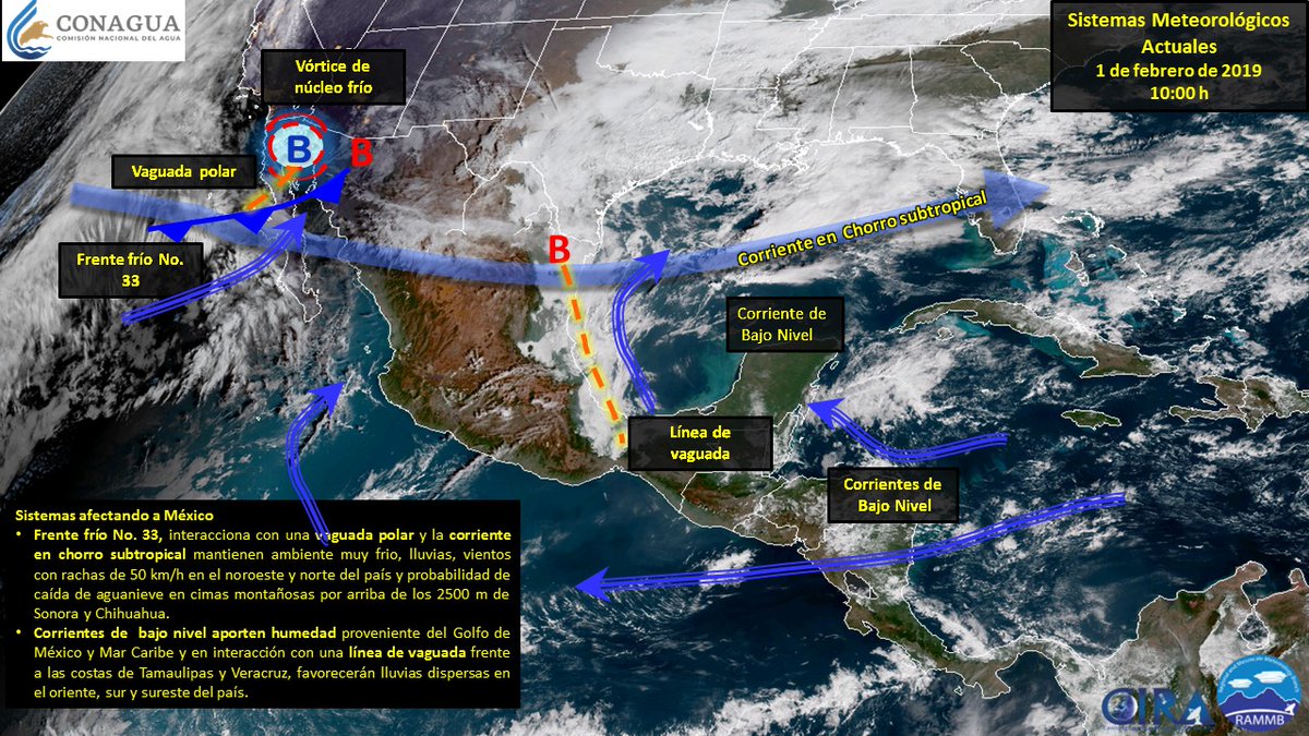 Viento de componente oeste de 15 a 30 km/h, potencial de chubascos en Baja california, caída de nieve o aguanieve en zonas altas del estado (San Pedro Mártir) y rachas de viento que pueden superar los 60 km/h.