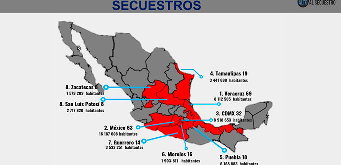 Los estados con mayor incidencia de este delito de alto impacto, en enero, son: Veracruz, con 51 secuestros; Estado de México, 26; Ciudad de México, 23; Puebla, 14; Tamaulipas, 19.